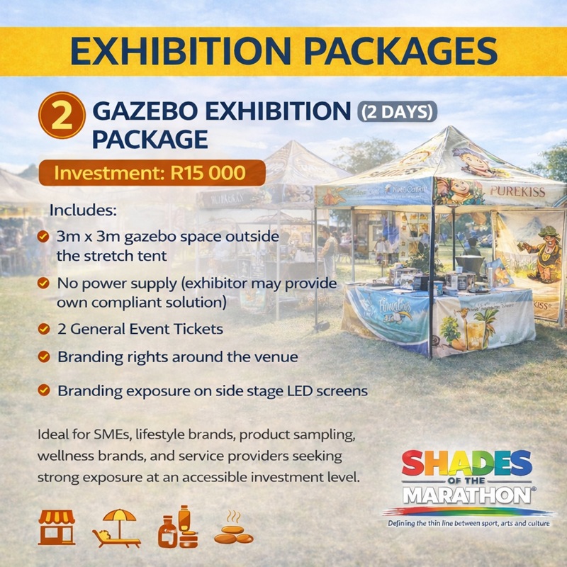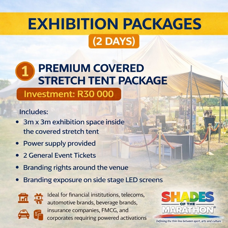 The Shades of the Marathon Business Expo is a premium two-day cultural and economic showcase hosted as part of the Shades of the Marathon Festival during the Two Oceans Marathon weekend in Cape Town. Taking place on 11–12 April 2026 at Malta Park Sports Field, Observatory, the Expo provides access to a combined audience of over 10,000 attendees across two days, including marathon runners, families, supporters, tourists, and lifestyle audiences in a celebratory post-race environment. Positioned as a high-impact entertainment and brand engagement platform, the Expo integrates arts, culture, tourism, business, and the creative industries on one national stage, offering corporates and exhibitors a strategic opportunity to activate, sample, and directly engage with a concentrated, experience-driven audience.